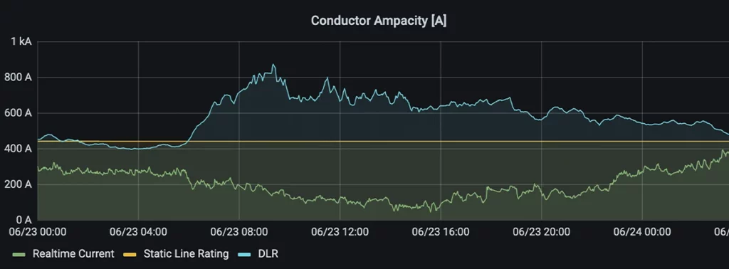SafeMon installert i nettstasjon. Grafen viser Conductor Ampacity [A] i SafeMon, som muliggjør dynamisk overføringskapasitet i linje- og kabelnettet og kan øke overføringskapasiteten med opptil 20 %. Modellen viser overført effekt (grønn), statisk maksgrense (gul) og reell kapasitet (blå).